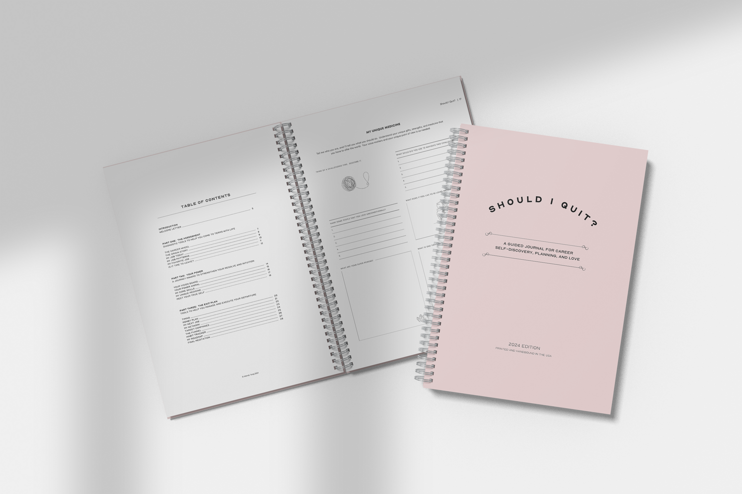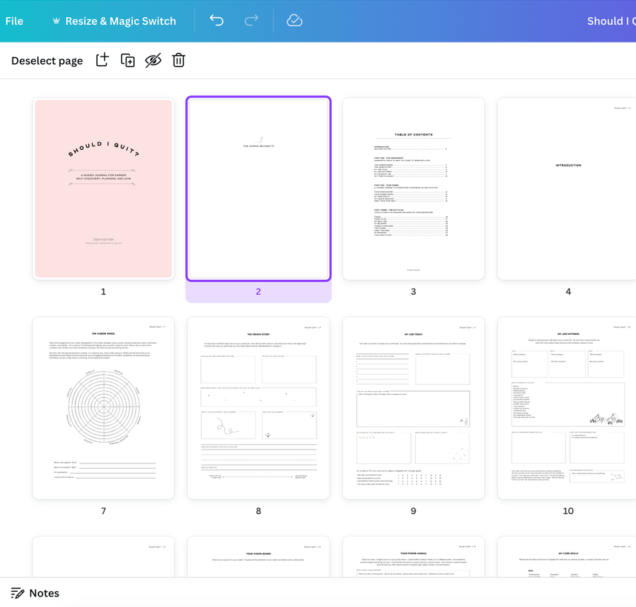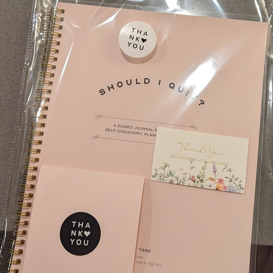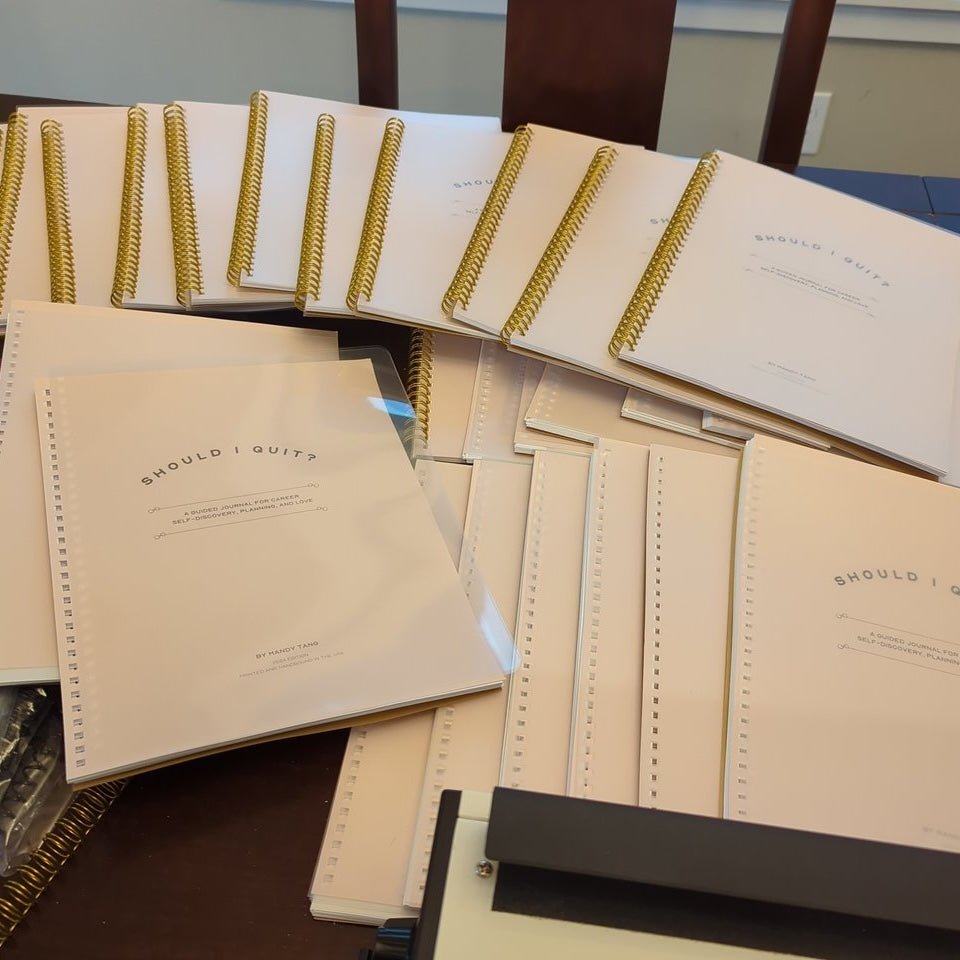 The "Should I Quit?" journal is a guided workbook for career self-discovery, planning, and love. A 28-page journal with exercises, and frameworks derived from career coach Mandy Tang. This is not just a journal with blank pages. There are 28 pages of prompts, fill in the blank questions, self-reflections, and guided exercises! Every single page is different.