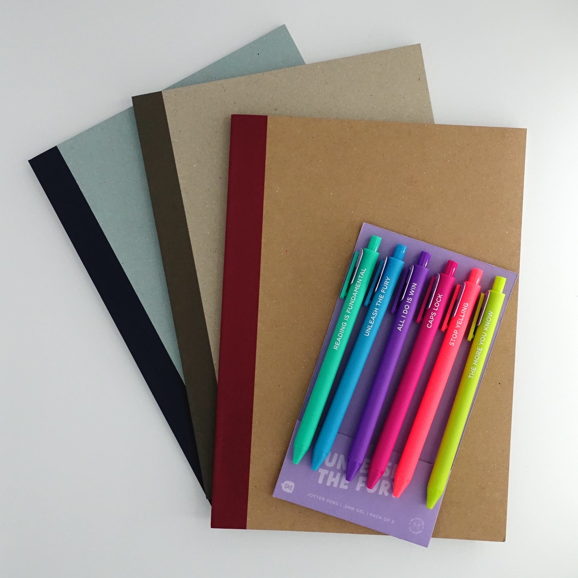 In this stationery pack, you will receive three notebooks and a six-pack of pens.