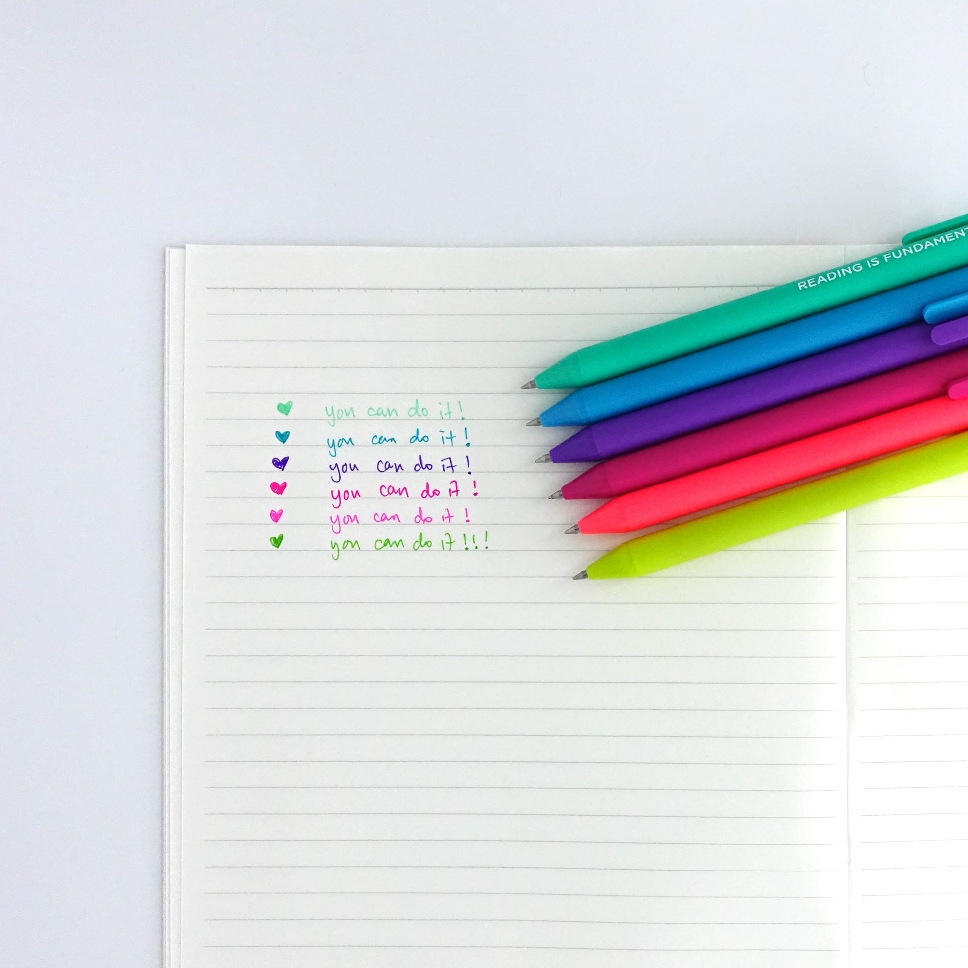 Jotter pens: the pens have a matte finish, and the ink matches the color of the pen. 0.5mm fine point gel ink. Pen colors may vary!
